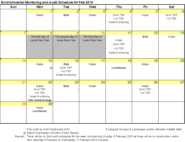The environmental site inspection and environmental monitoring will be continued in the coming month. Impact monitoring for air, noise, water quality, ecology and landscape and visual in accordance with the approved EM&A Manual has commenced since 12 May 2010. The tentative monitoring schedule for March 2016 is shown in the Table 8.1.