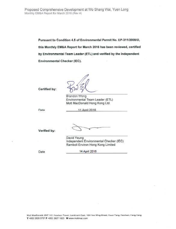 Mott MacDonald Hong Kong Ltd. (“MMHK”) has been commissioned by the Contractor, Heng Shung Construction Co. Ltd., to undertake the Environmental Team (ET) services to carry out environmental monitoring and audit (EM&A) for both pre-construction and construction phases of the Proposed Comprehensive Development at Wo Shang Wai, Yuen Long.