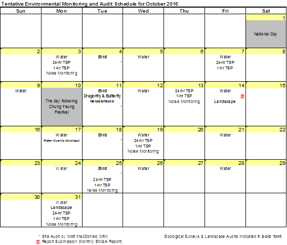 The environmental site inspection and environmental monitoring will be continued in the coming month. Impact monitoring for air, noise, water quality, ecology and landscape and visual in accordance with the approved EM&A Manual has commenced since 12 May 2010. The tentative monitoring schedule for October 2016 is shown in the Table 8.1.