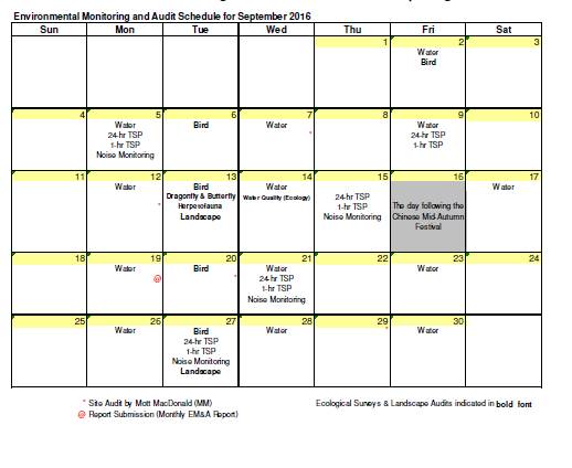 Site audits were carried out on 7, 12, 20 and 29 September 2016 to confirm the implementation measures undertaken by the Contractor in the reporting month. The outcomes are presented in Section 6 and the status of implementation of mitigation measures in the site is shown in Appendix L.