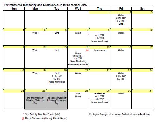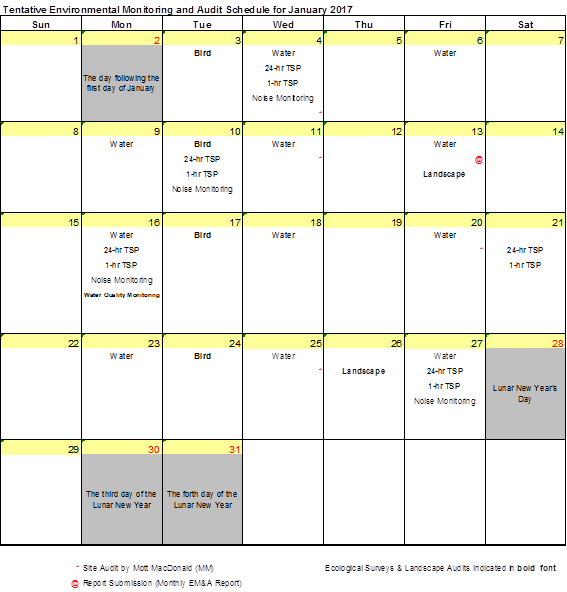 The environmental site inspection and environmental monitoring will be continued in the coming month.  Impact monitoring for air, noise, water quality, ecology and landscape and visual in accordance with the approved EM&A Manual has commenced since 12 May 2010. The tentative monitoring schedule for January 2017 is shown in the Table 8.1