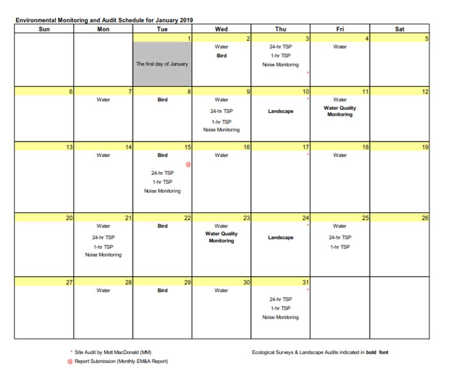 The environmental site inspection and environmental monitoring will be continued in the coming month. Impact monitoring for air, noise, water quality, ecology and landscape and visual in accordance with the approved EM&A Manual has commenced since 12 May 2010. The tentative monitoring schedule for January 2019 is shown in the Table 8.1.