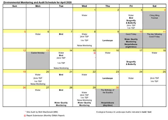 Site audits were carried out on 3, 9, 15, 23 and 29 April 2020 to confirm the implementation measures undertaken by the Contractor in the reporting month. The outcomes are presented in Section 6 and the status of implementation of mitigation measures in the site is shown in Appendix L.