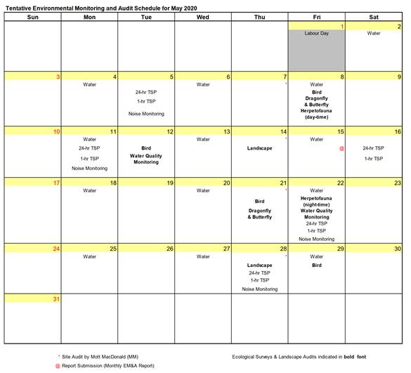 The environmental site inspection and environmental monitoring will be continued in the coming month. Impact monitoring for air, noise, water quality, ecology and landscape and visual in accordance with the approved EM&A Manual has commenced since 12 May 2010. The tentative monitoring schedule for May 2020 is shown in the Table 8.1.