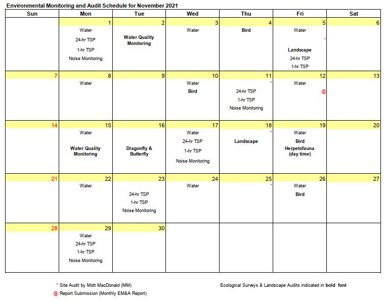 The environmental site inspection and environmental monitoring will be continued in the coming month. Impact monitoring for air, noise, water quality, ecology and landscape and visual in accordance with the approved EM&A Manual has commenced since 12 May 2010. The tentative monitoring schedule for November 2021 is shown in the Table 8.1.