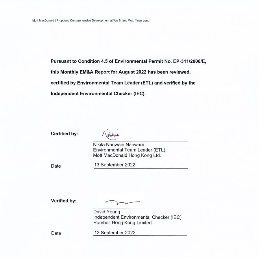 Mott MacDonald Hong Kong Ltd. (“MMHK”) has been commissioned to undertake the Environmental Team (ET) services to carry out environmental monitoring and audit (EM&A) for both pre-construction and construction phases of the Proposed Comprehensive Development at Wo Shang Wai, Yuen Long.
