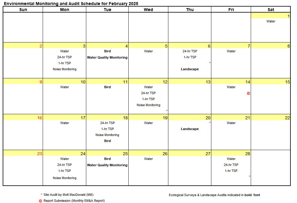 The environmental site inspection and environmental monitoring will be continued in the coming month. Impact monitoring for air, noise, water quality, ecology and landscape and visual in accordance with the approved EM&A Manual has commenced since 12 May 2010. The tentative monitoring schedule for February 2025 is shown in Table 8.1.