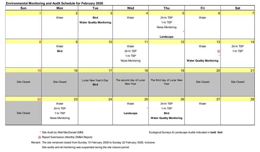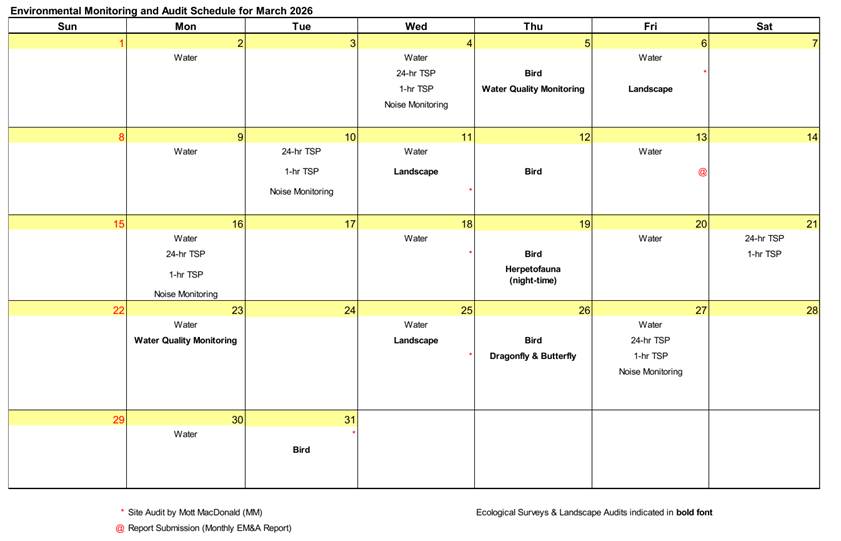 The environmental site inspection and environmental monitoring will be continued in the coming month. Impact monitoring for air, noise, water quality, ecology and landscape and visual in accordance with the approved EM&A Manual has commenced since 12 May 2010. The tentative monitoring schedule for March 2026 is shown in Table 8.1.