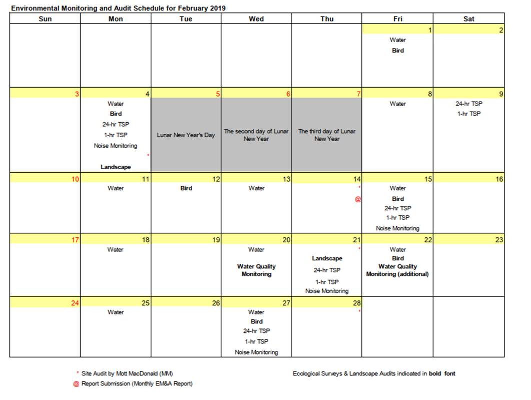 The environmental site inspection and environmental monitoring will be continued in the coming month. Impact monitoring for air, noise, water quality, ecology and landscape and visual in accordance with the approved EM&A Manual has commenced since 12 May 2010. The tentative monitoring schedule for March 2019 is shown in the Table 8.1.