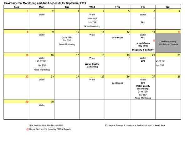 Site audits were carried out on 6, 12, 19 and 26 September 2019 to confirm the implementation measures undertaken by the Contractor in the reporting month. The outcomes are presented in Section 6 and the status of implementation of mitigation measures in the site is shown in Appendix L.