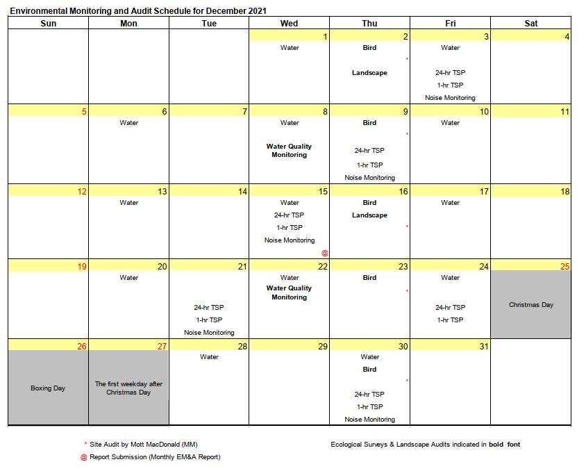 The environmental site inspection and environmental monitoring will be continued in the coming month. Impact monitoring for air, noise, water quality, ecology and landscape and visual in accordance with the approved EM&A Manual has commenced since 12 May 2010. The tentative monitoring schedule for December 2021 is shown in the Table 8.1.
