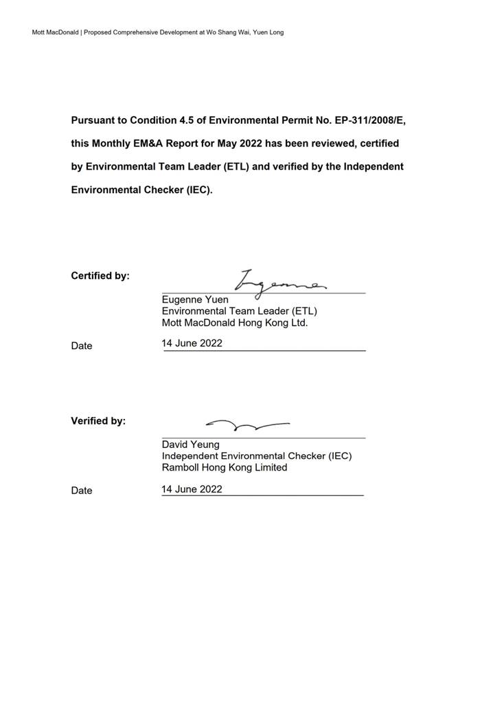 Mott MacDonald Hong Kong Ltd. (“MMHK”) has been commissioned by the Contractor, Heng Shung Construction Co. Ltd., to undertake the Environmental Team (ET) services to carry out environmental monitoring and audit (EM&A) for both pre-construction and construction phases of the Proposed Comprehensive Development at Wo Shang Wai, Yuen Long. From August 2016, the Project Proponent, Profit Point Enterprises Limited, commissioned MMHK to continue the ET services.