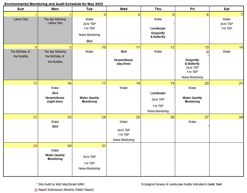 Site audits were carried out on 5, 13, 19 and 27 May 2022 to confirm the implementation measures undertaken by the Contractor in the reporting month. The outcomes are presented in Section 6 and the status of implementation of mitigation measures in the site is shown in Appendix L.