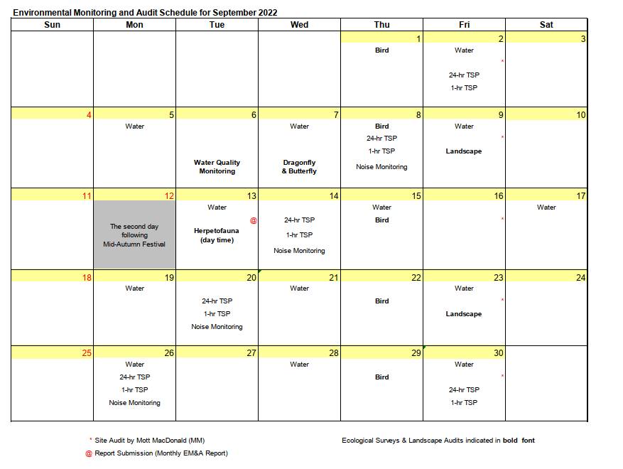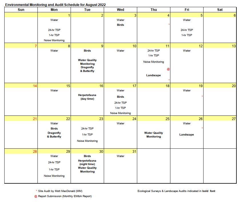 The environmental site inspection and environmental monitoring will be continued in the coming month. Impact monitoring for air, noise, water quality, ecology and landscape and visual in accordance with the approved EM&A Manual has commenced since 12 May 2010. The tentative monitoring schedule for September 2022 is shown in the Table 8.1.