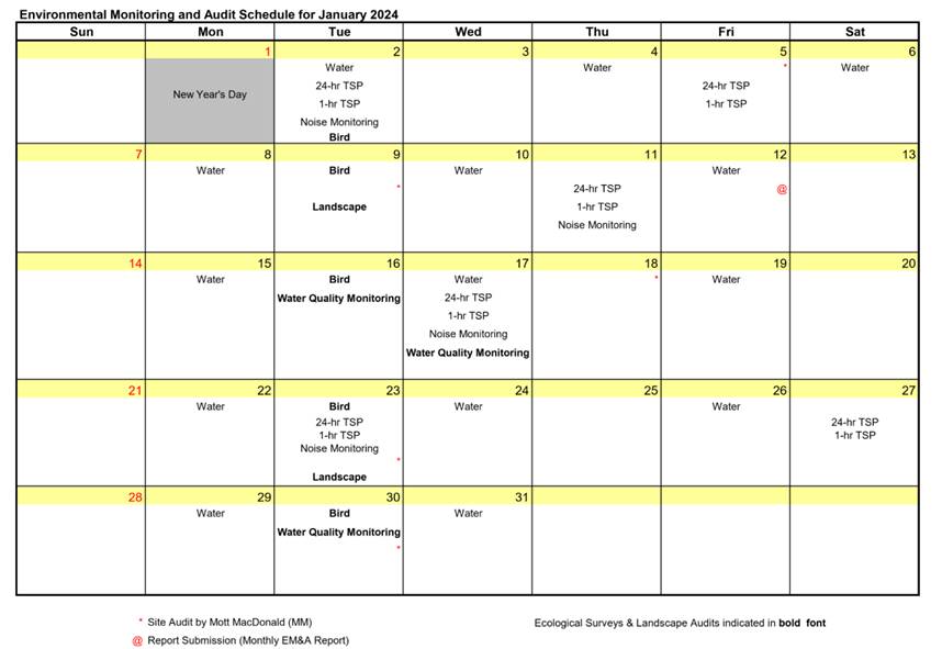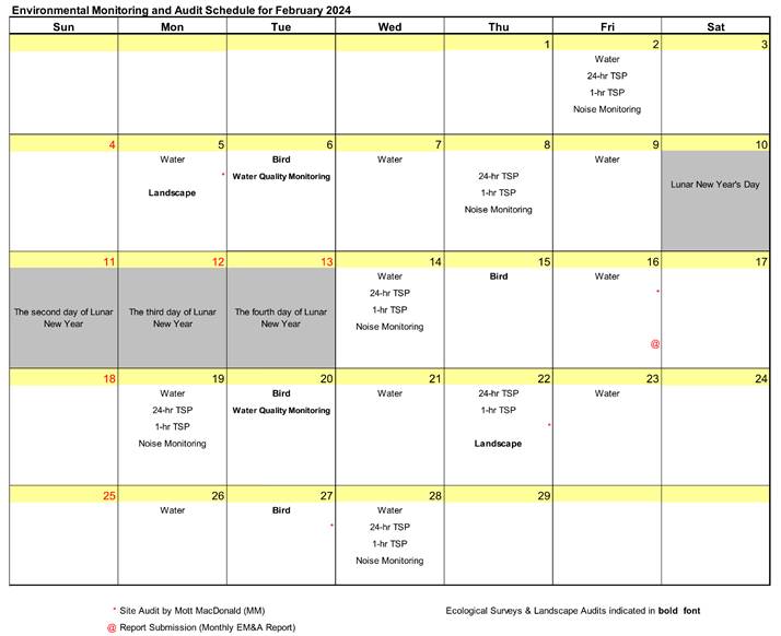 The environmental site inspection and environmental monitoring will be continued in the coming month. Impact monitoring for air, noise, water quality, ecology and landscape and visual in accordance with the approved EM&A Manual has commenced since 12 May 2010. The tentative monitoring schedule for February 2024 is shown in the Table 8.1.